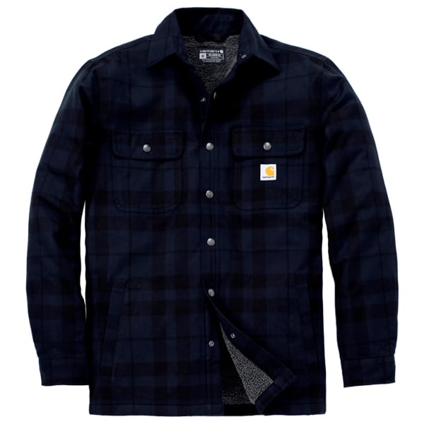 Relaxed Fit · Offener Kragen · Zwei Falten entlang der hinteren Sattelnaht für mehr Bewegungsfreiheit · Lange Ärmel · Zwei Brusttaschen mit Patten und Druckknopfverschlüssen · Zwei untere Leistentaschen vorne · Brusttasche innen · Druckknöpfe mit Antik-Nickel-Finish · Verstellbare Manschetten mit zwei Knöpfen und langen Schlitzen · Abfallender Saum für mehr Abdeckung · Dreifach gesteppte Hauptnähte · Carhartt-Label auf Tasche genäht · Gewebt · 8 oz/yd² – 272 gsm · Flanell unifarben & gemustert · Sherpa-Futter für zusätzliche Wärme